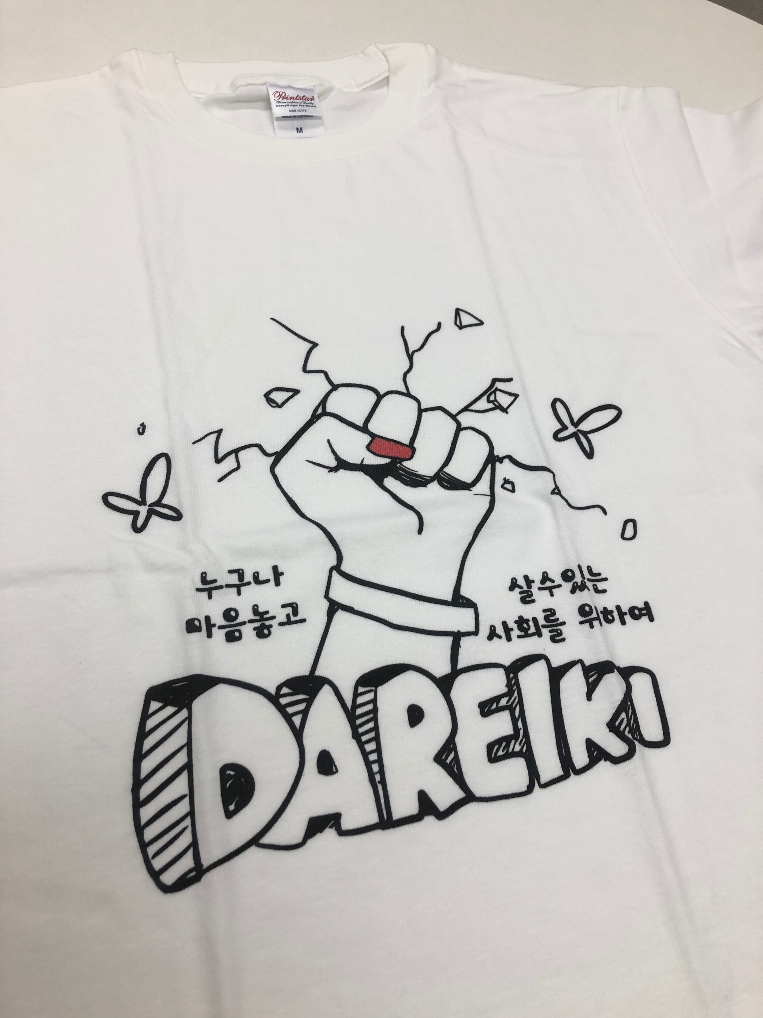 ~さまざまな「らしさ」を押しつけてくる窮屈な社会を変え、特に女性たちの前に立ちはだかる目に見えない「ガラスの天井」を打ち破ろう!というパワーを込めた拳が描かれています。下にはアルファベットで「DAREIKI」、ハングルで「だれもがいきいきと生きられる社会のために」の文字が書かれています。ネイルの赤色がアクセント。YUN LEEによるデザイン。